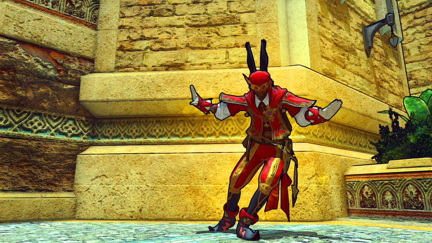 Throughout his journey through Eorzea, Domenica eventually stumbled upon Ul'Dah, where he witnessed a troupe of entertainers and dancers which stayed on his mind for days. He would occasionally watch them from afar, but was delighted by their music and dance. Upon noticing one day of their absence, Domenica decided to take it upon himself to attempt to entertain the crowd in the spot where they played. He didn't draw much of a crowd, but the few that stood and watched him was enough for him to feel a purpose, and so he donned a jester's outfit and became known as "The Crimson Jester", where he would occasionally dance to music around Ul'Dah to dazzle and entertain.