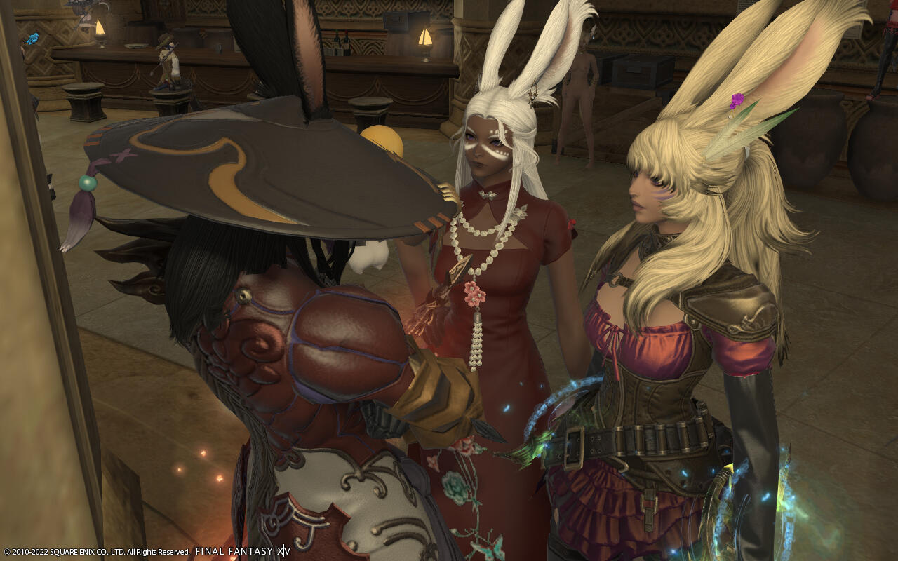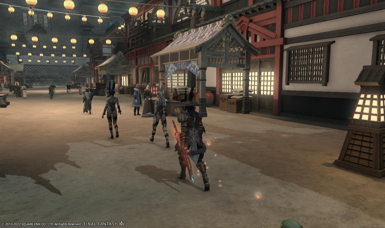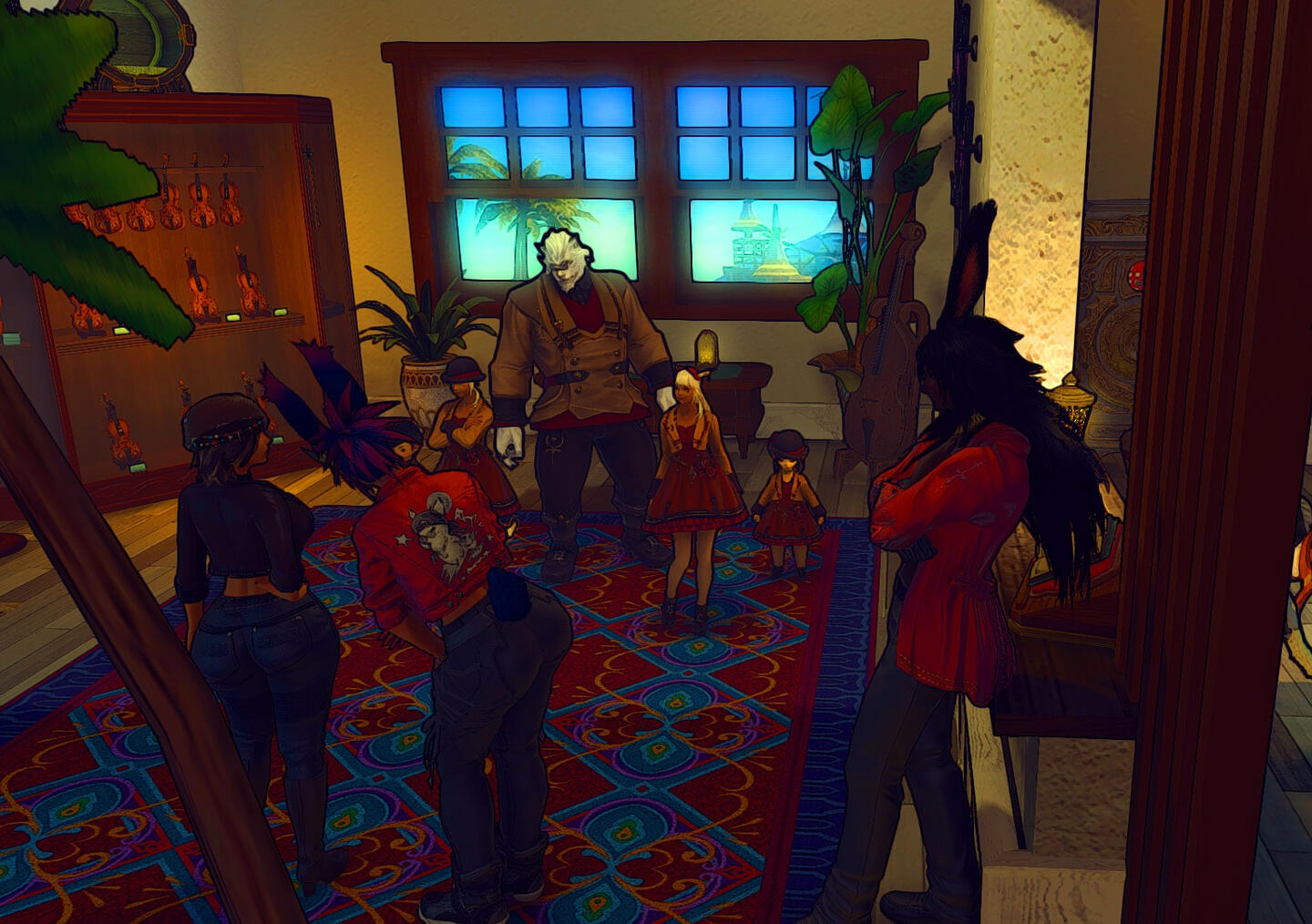 After Domenica's distraction from Ul'Dah, he would eventually move on, drifting away as he would experience adventures as well as seeing the heroes who prevented The Final Days from occurring. Domenica would be inspired by such heroism, which would soon lead him to helping others in need and he would make a friend or two along the way. After much time he eventually returned to Ul'Dah to rest. It is then, that Domenica saw the troupe he was so fond of, performing for the people who surrounded them.He felt more courageous as before and approached the crowd, and eventually decided to guard the troupe from fans who felt a little too comfortable around the performers. One of the performers took a liking to him, and offered friendship as well as a community for him to be a part of. Domenica would eventually join this troupe of perfomers, where he is currently bodyguarding for them to this very day. Has Domenica found his purpose in life? Or will he eventually drift away into his next adventure? Who's to say?